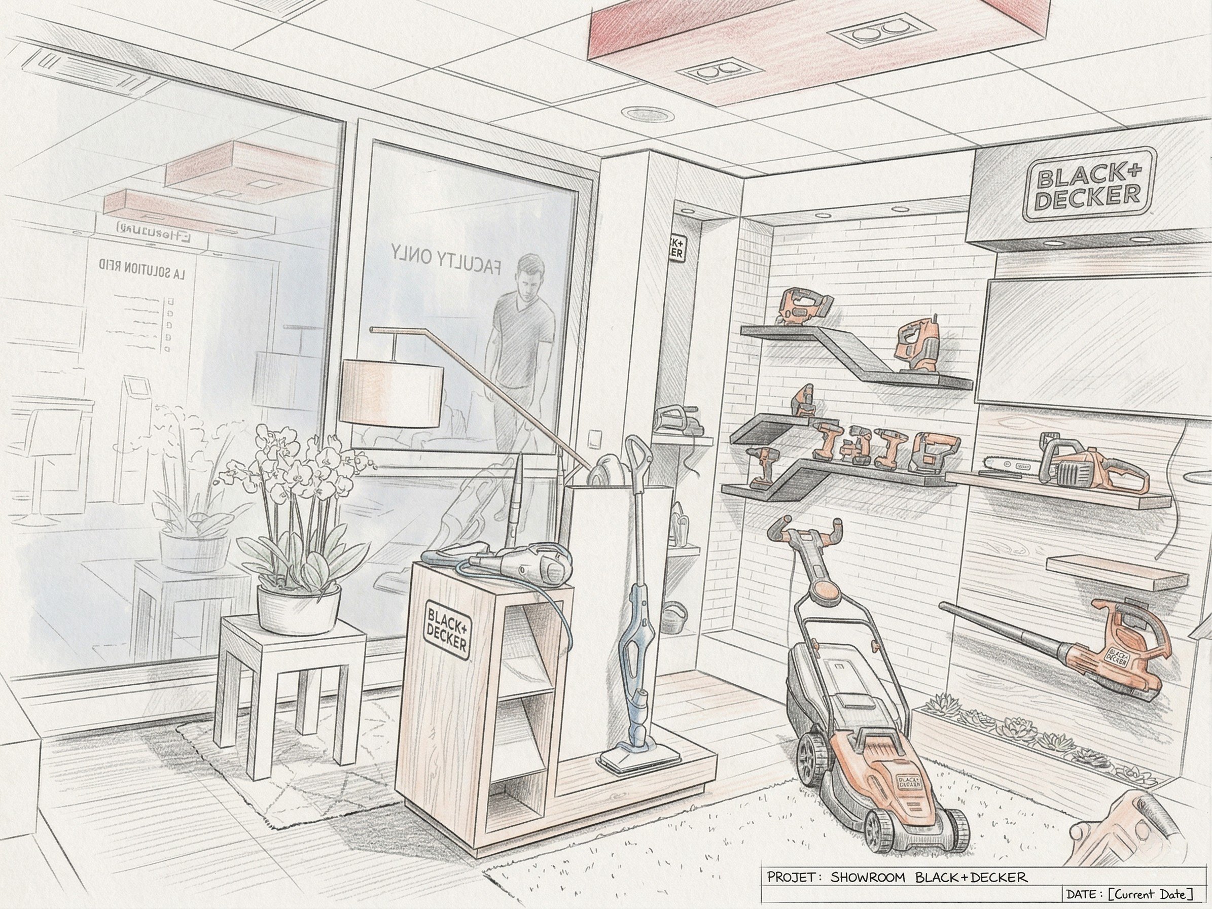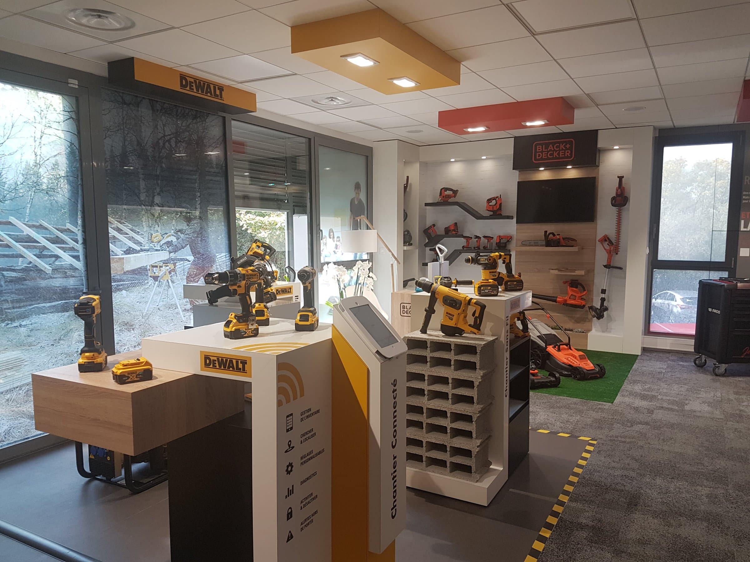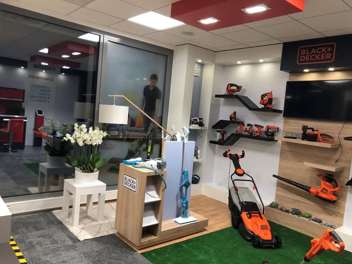 Le groupe SBDINC avait besoin d’un espace d’exposition capable de valoriser la richesse de son catalogue, allant de l’outillage lourd pour les professionnels (Facom, DeWalt) au matériel de jardinage et de petit électroménager (Black & Decker).